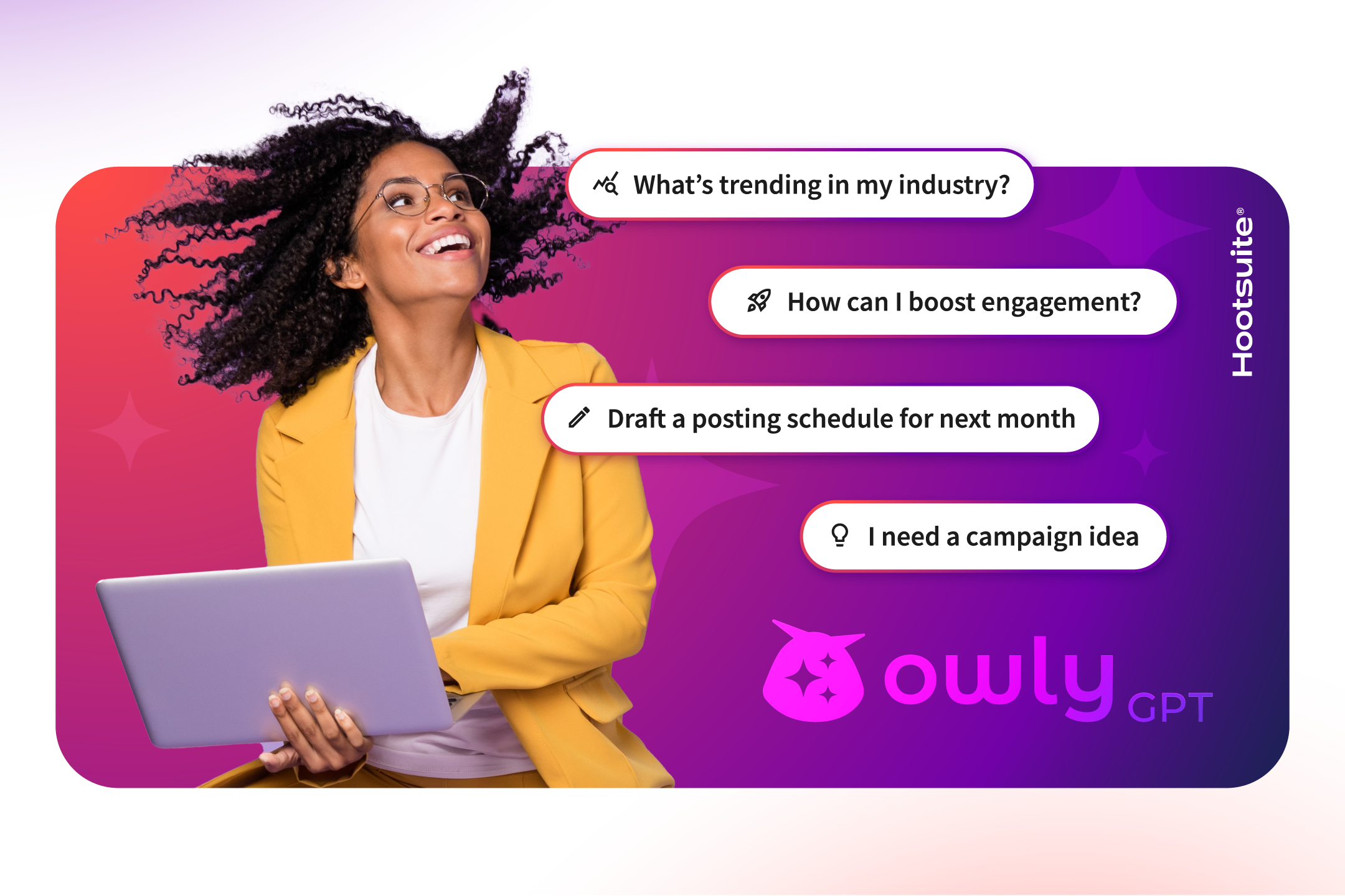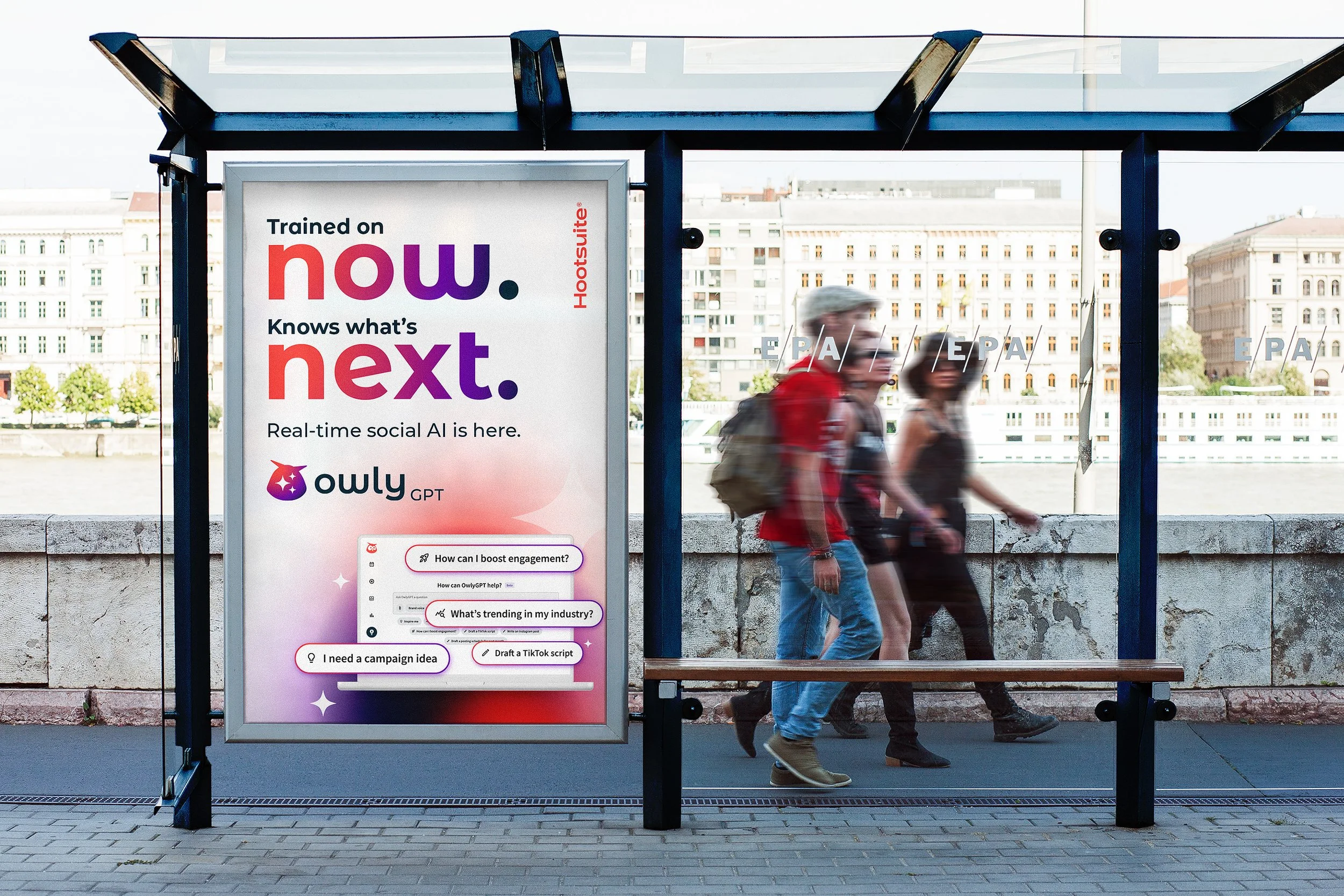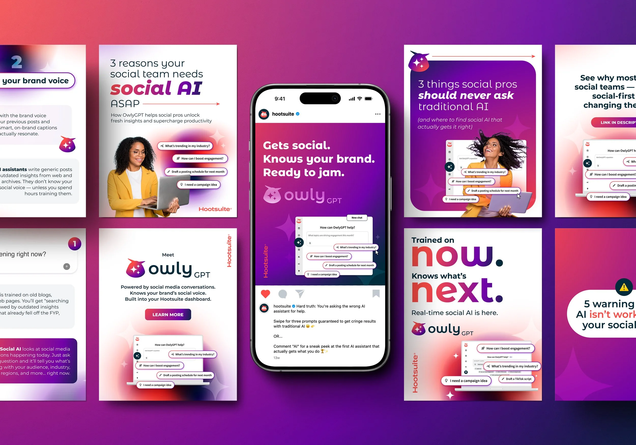 OwlyGPT is Hootsuite’s AI-driven social media assistant, designed to help marketers generate posts, captions, and ideas directly within the platform. I led the visual direction for the product launch, developing the creative concept, campaign visuals, and asset system across web, video, and paid media. The goal was to introduce a complex new product in a clear, credible, and visually engaging way that aligned with Hootsuite’s brand identity.